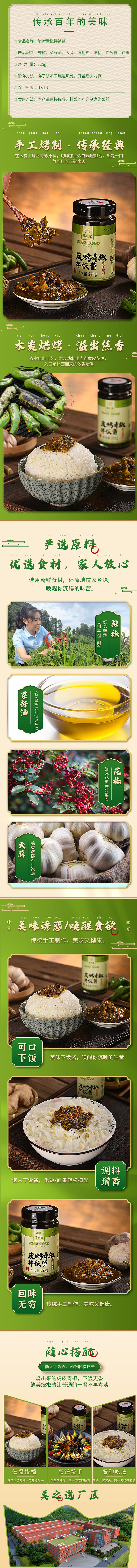 產(chǎn)品簡(jiǎn)要:碳烤青椒醬 碳烤青椒醬采用純手工的碳烤方式,用貴州本特色鮮椒,大蒜,等用科學(xué)配方和現(xiàn)代工藝精制而成,香辣可口,是拌面和佐餐之佳品,其中含有維生素、辣椒素、蛋白質(zhì)、礦物質(zhì)等較高營(yíng)養(yǎng)成分,具有獨(dú)特地方風(fēng)味的佐餐調(diào)味品,是居家旅游的方便佳品。